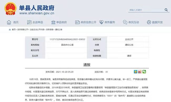 Shanxian County, Heze City, Shandong Province reported "stroke in the whole village". Screenshot of official website of Shan County People’s Government